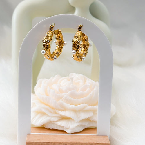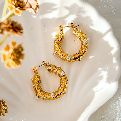 Our "BELLA" gold hoops are striking earrings that feature a textured design adorned with pearls and sparkling zirconia stones. Their unique shape and luxurious gold finish make them an eye-catching accessory perfect for adding a touch of elegance to any outfit. Ideal for both casual and special occasions, these hoops blend classic beauty with modern flair.