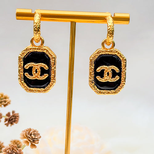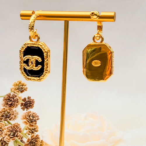 Introducing the "CASSIA" earrings—where elegance meets timeless luxury. These exquisite drop earrings feature a striking combination of a rich black enamel backdrop elegantly framed by opulent gold detailing. The iconic logo adds a touch of sophistication, making them the perfect accessory for any occasion. Elevate your style and make a statement with this must-have piece.
