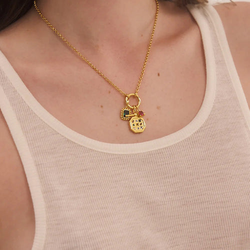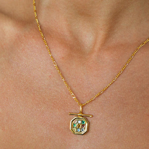 Our “DELPHINE” pendant is a modern take on a fob style design. It features an eight-sided charm with a small fob bar, and the face of the pendant is adorned with nine small coloured gemstones. The pendant includes an oval loop, allowing it to be easily attached to a variety of chains. Additionally, it can be found paired with our chains.