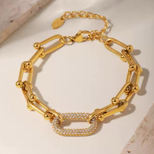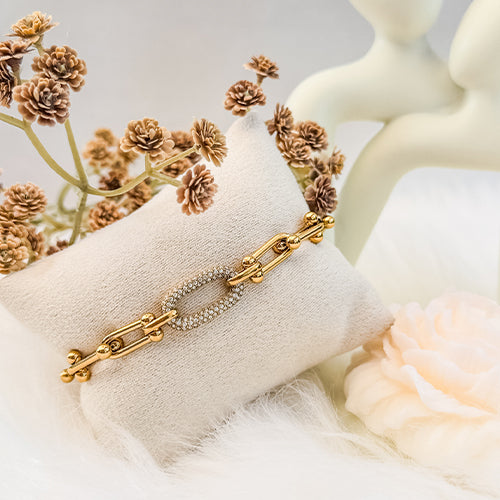 Our “GOLDEN LINK ELEGANCE” bracelet features a sophisticated design that showcases interconnected links crafted from high-quality materials. Its warm gold tone adds a touch of luxury, making it suitable for both everyday wear and special occasions. The bracelet’s polished finish enhances its shine, while the seamless flow of links creates a graceful silhouette that complements various outfits. This versatile piece is designed to be both timeless and contemporary, making it a cherished addition to any jewelry collection.