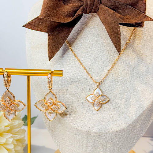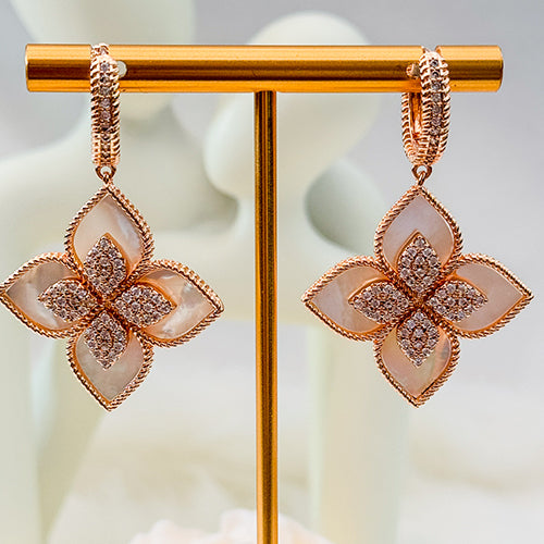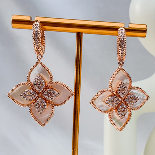 Introducing the “ISABEAU CLOVER” Earrings, a stunning blend of luxury and elegance. Designed with exquisite Mother of Pearl (MOP) and adorned with shimmering cubic zirconia, these earrings showcase a floral motif that captures attention. The intricate details and rose gold finish add a touch of sophistication, making them perfect for both special occasions and everyday elegance. Elevate your jewelry collection with these timeless pieces that embody grace and style.