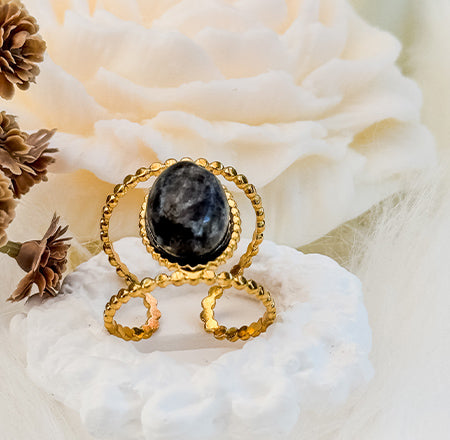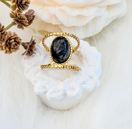 Our “JANA” carbon black exquisite ring features a striking carbon black onyx stone, set in a beautifully crafted gold-tone band. The oval-shaped stone, known for its deep, rich black hue, is elegantly surrounded by a braided gold frame that adds dimension and sophistication. The band itself has a unique design with intricate detailing, enhancing the overall charm of the piece. Perfect for both casual and formal occasions, this ring makes a bold statement while maintaining a sense of refined elegance. Ideal for those who appreciate artisan jewellery with a modern flair.