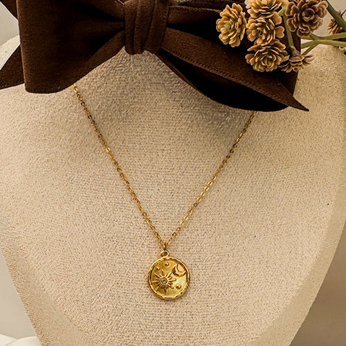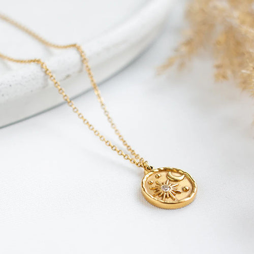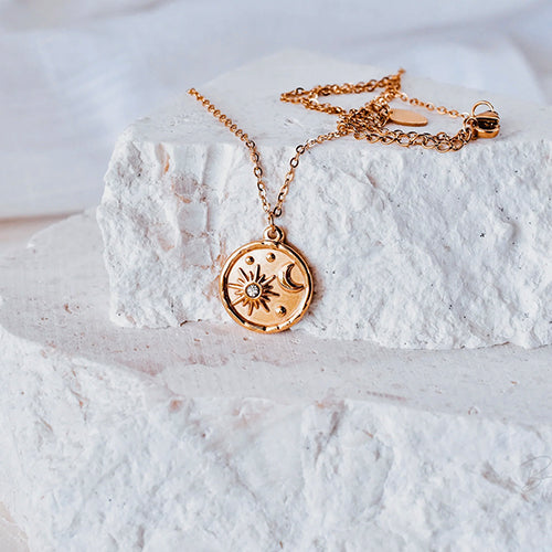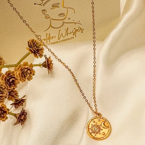 Our "LUNAR STAR" Necklace features a delicate design combining a half moon and a star, accented by a single diamond. Crafted in high-quality metal, this piece offers a timeless elegance that can complement both casual and formal attire. The adjustable chain allows for versatile styling, making it a perfect addition to any jewellery collection.