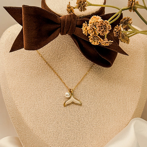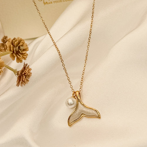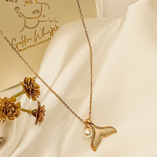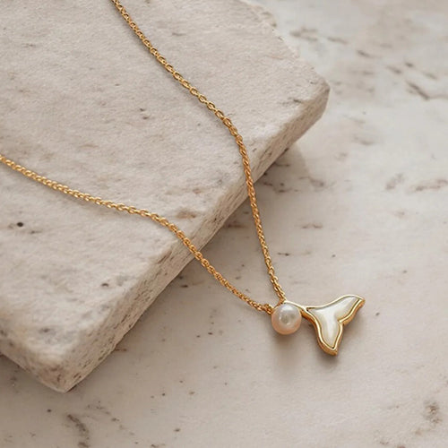 The "LUSTROUS FIN" Necklace features a stunning fish tail design crafted from high-quality materials, adorned with a beautiful mother of pearl element. The natural iridescence of the mother of pearl adds a touch of elegance and sophistication to the piece. The necklace is suspended on a delicate chain, which allows for adjustable length to suit various styles. This versatile accessory is suitable for both casual and formal occasions, making it a lovely addition to any jewellery collection.